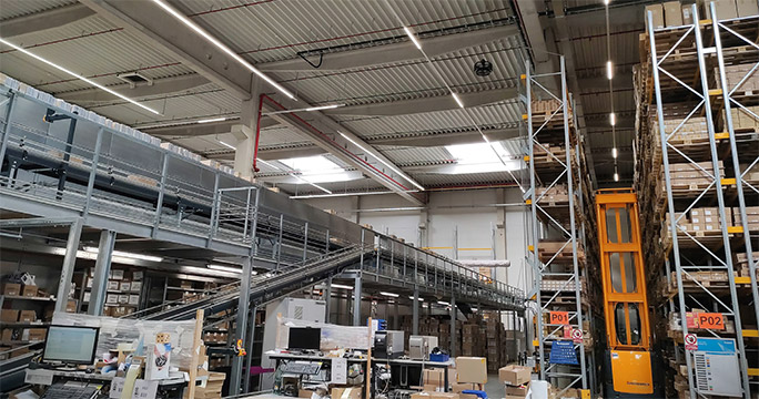Controlled lighting in an industrial hall can also reflect planned breaks. This ensures that no light is shone unnecessarily during a break. Wastage is also stopped in warehouse areas where employees only move between shelves for a few minutes. The installation of motion sensors has also stopped unnecessary lighting here. In addition, we connected Savee to the alarm system to ensure that all lights go off automatically when they are supposed to – after the last employee leaves.
